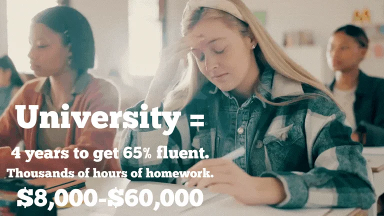 There are too many companies pretending to solve the problem by teaching you slowly, charging you month after month. Think about it, the longer it takes you to learn, the more money they make. We won't name names, but you probably know. And we commend you for trying to use any of the methods below if you have, but these methods are slower, harder, inefficient and do not lead to fluency.